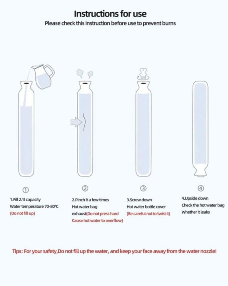 - قربة متعددة الوظائف ,يمكن استخدام قربة الماء الساخن للضغط الساخن أو البارد لتخفيف آلام العضلات وتسكين تقلصات الدورة الشهرية والإصابات الرياضية وما إلى ذلك.