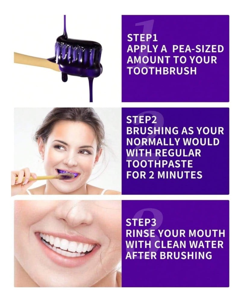 - تنظيف عميق للأسنان: يتغلغل معجون الأسنان الأرجواني لتبييض الأسنان في شقوق مينا الأسنان لإزالة بقايا الطعام والبقع العميقة الموجودة فيه. لا يترك أي بقايا ويساعد على تنظيف الأسنان بشكل فعال للحصول على ابتسامة أكثر جمالا.