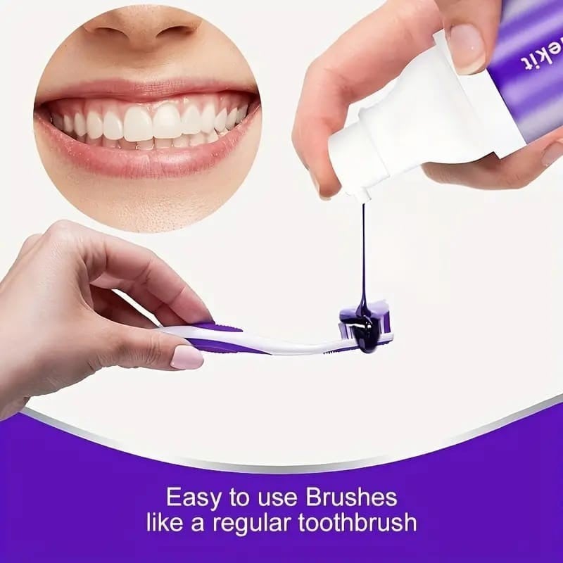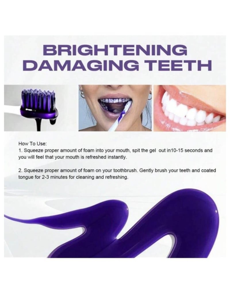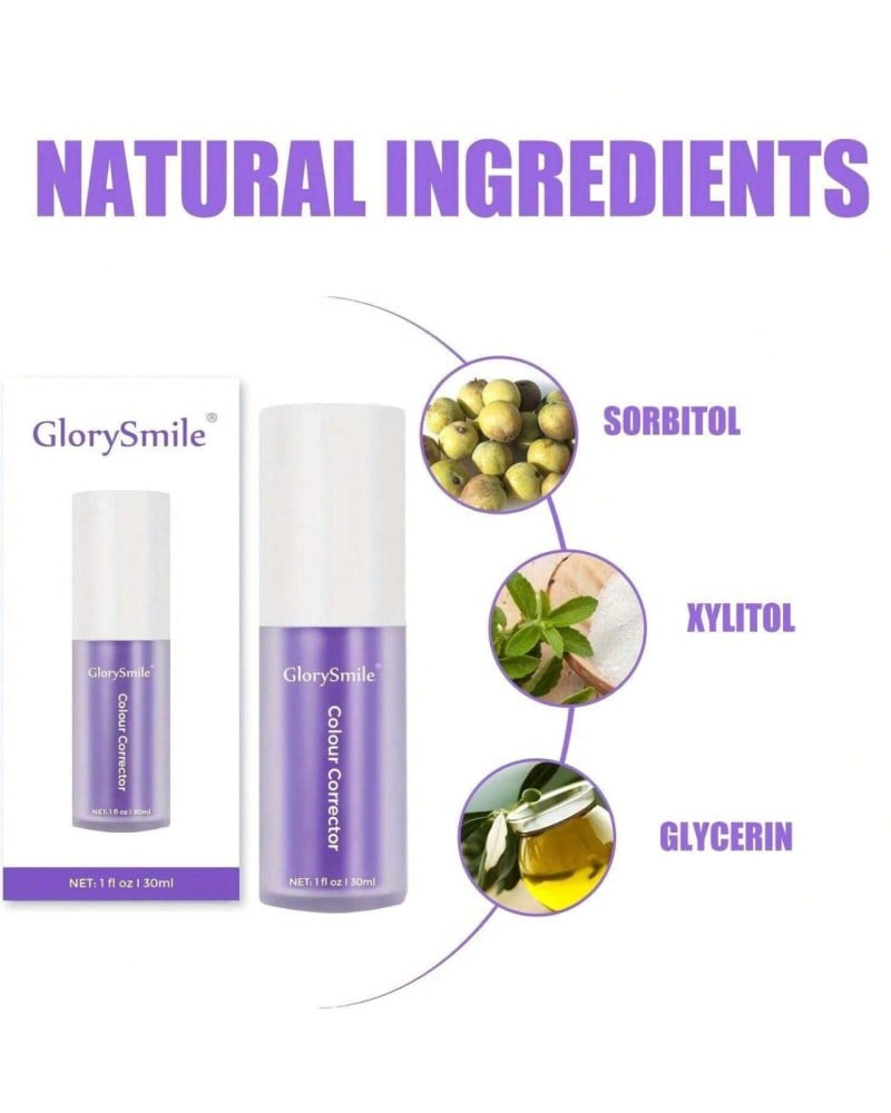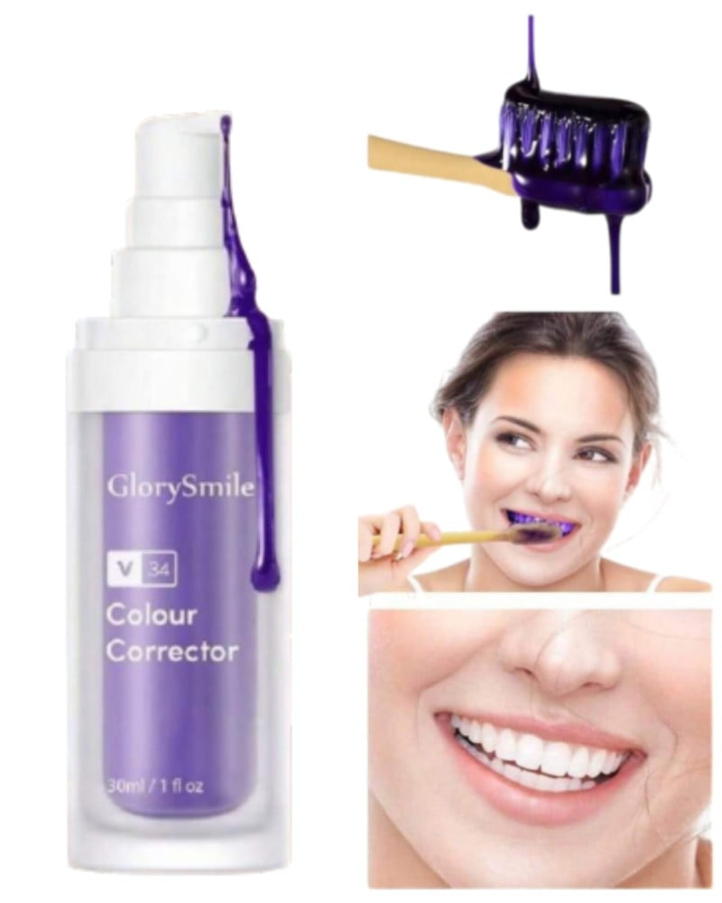 - معجون أسنان أرجواني مصحح لون الأسنان هو علاج تبييض غير جراحي. يزيل جميع درجات اللون الأصفر للحصول على ابتسامة أكثر إشراقًا دون ترك أي بقايا.